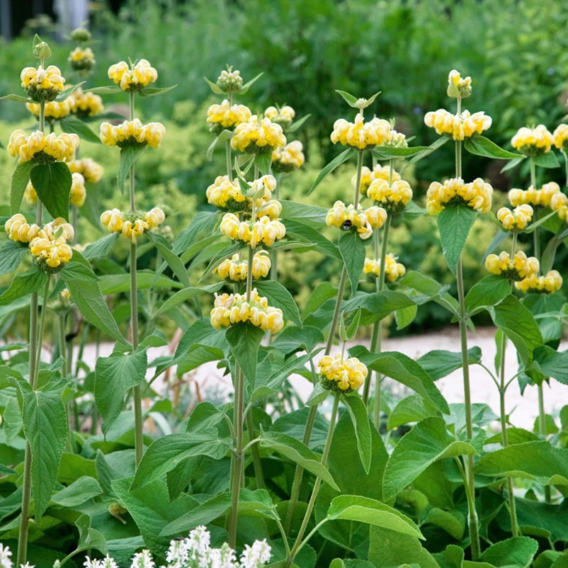 Mit dem gelbblühenden Brandkraut treffen Sie die richtige Wahl, um Steingarten, Bauerngarten, das Staudenbeet oder den Gehölzrand in fröhlichem Gelb erstrahlen zu lassen. Das Brandkraut (Phlomis russeliana) gilt als schneckenunempfindlich und ist bei Bienen sehr beliebt, wodurch es zu einer hervorragenden Bienenweide wird. Wer nicht genug von der herrlichen Pflanze bekommen kann, nutzt das Brandkraut als Schnittpflanze und genießt es als Schnittblume in der Vase. Von Juni bis August schmückt sich die buschig und aufrecht wachsende, horstbildende Pflanze mit gelben Blüten, die wunderbar mit den grau-grünen, herzförmigen Blättern harmonieren. Die wintergrüne Gartenstaude erreicht eine Wuchshöhe von 60 bis 100 cm und ist sehr gut frostverträglich. Bevorzugt wächst das Brandkraut in lockeren, nährstoffreichen Böden an einem sonnigen Standort.