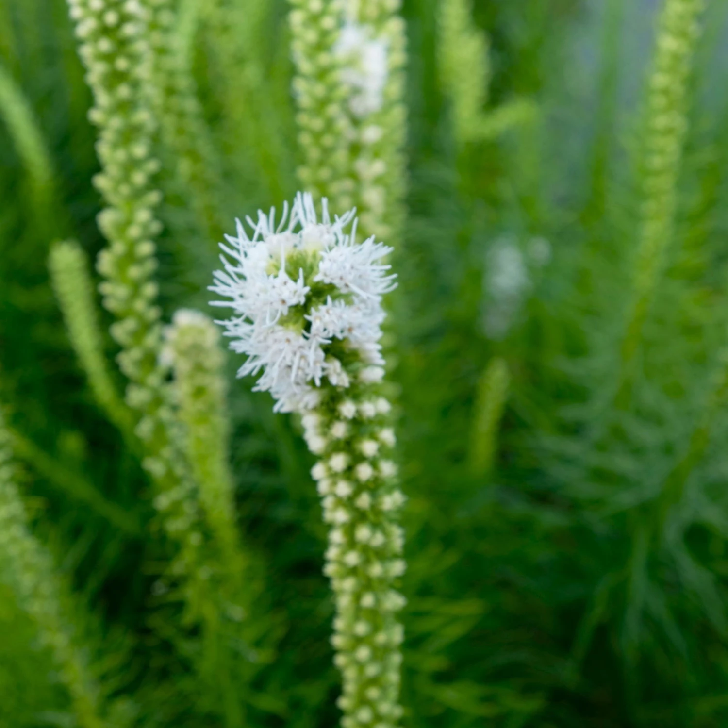 Zauberhaft erblühen die besonderen Blüten der Prachtscharte. Über eine lange Zeit öffnen sich die reinweißen Blüten am Stiel von unten nach oben und erfreuen so mit langer Pracht. Bienen und andere Insekten dient die winterharte Staude als wertvolle Nahrungsquelle im Hochsommer. Mit ihrem aufrechten Wuchs eignet sich die Prachtscharte, die auch Liatris genannt wird, als Mittelpunkt im Staudenbeet. Bis zu 60 cm hoch wird die robuste Schönheit und fügt sich so bestens in gemischte Pflanzungen mit anderen sommerblühenden Stauden ein. Aparte Pflanzungen ergeben sich aus Kombinationen von Prachtscharte mit Gräsern oder Sonnenhut.