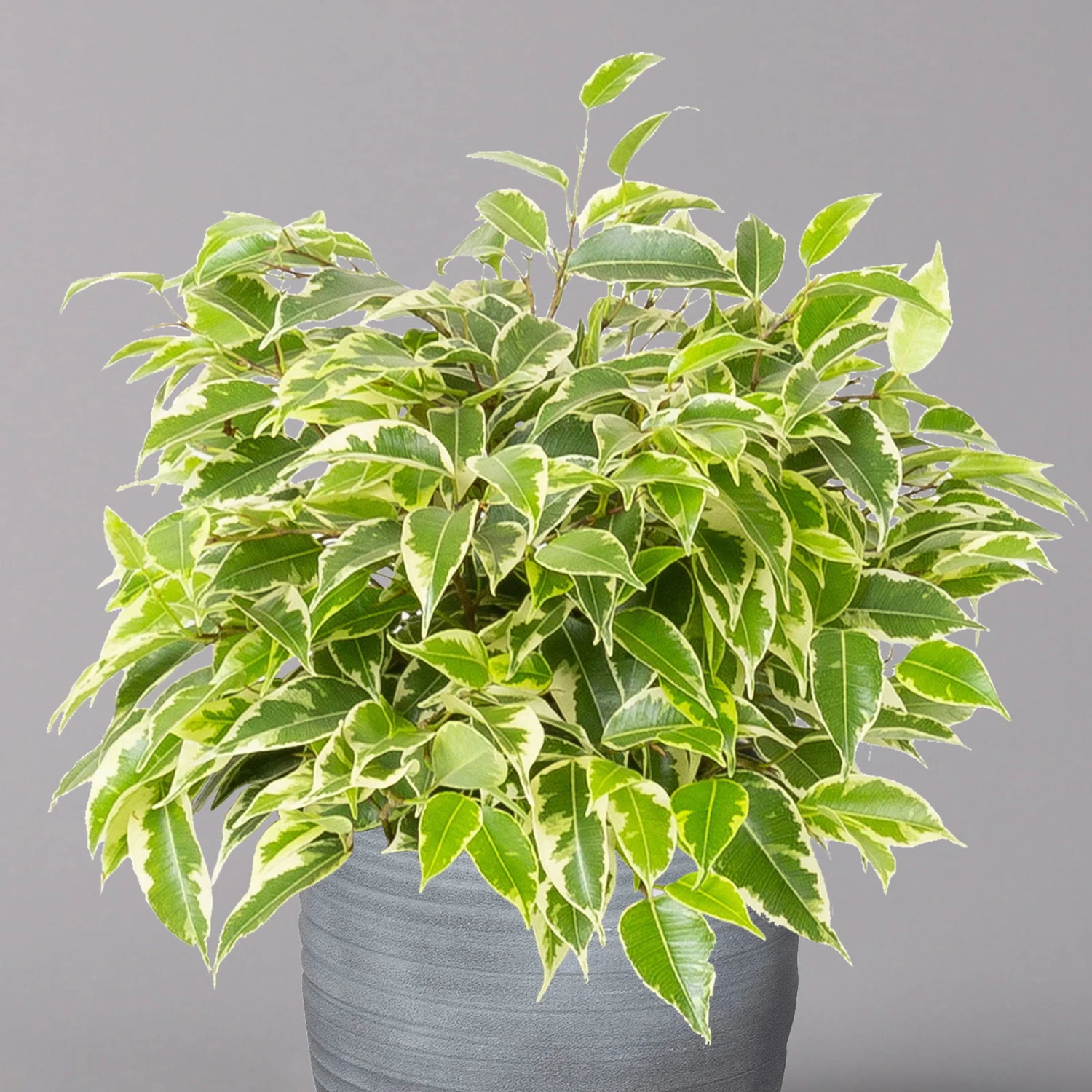 Die Birkenfeige (Ficus benjamina), bei uns auch unter den Namen ‚Benjamini‘ oder einfach nur ‚Ficus‘ bekannt, ist eine klassische Grünpflanze für Zimmer und Büro, die sich seit vielen Jahren großer Beliebtheit erfreut. Charakteristisch sind die elliptischen, zugespitzten Blätter, die je nach Art rein grün oder mit weißer bis gelber Panaschierung versehen sind. Die glänzenden, glatten Blätter sitzen an auffallend dünnen Zweigen, die an den Spitzen leicht überhängen. Die Sorte ‚Kinky‘ kann bei guter Pflege bis zu knapp 1 Meter hoch werden.