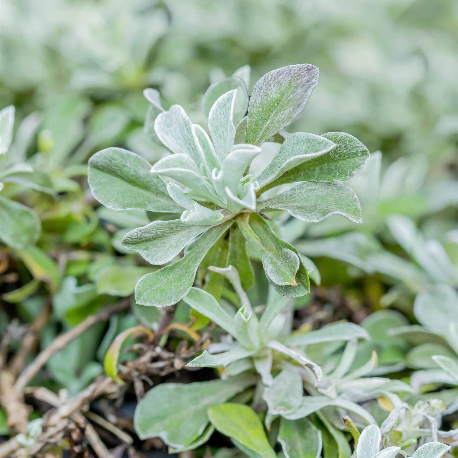 Die lanzettlichen Blätter des Katzenpfötchens (Antennaria dioica ‚Rubra‘) sind silbergrau und behaart. Das Katzenpfötchen wächst teppichartig, kriechend in kleinen Rosetten und ist bodendeckend. Die winterharte Staude kann eine Wuchshöhe von 10 bis max. 15 cm erreichen.